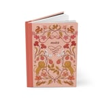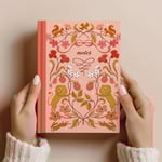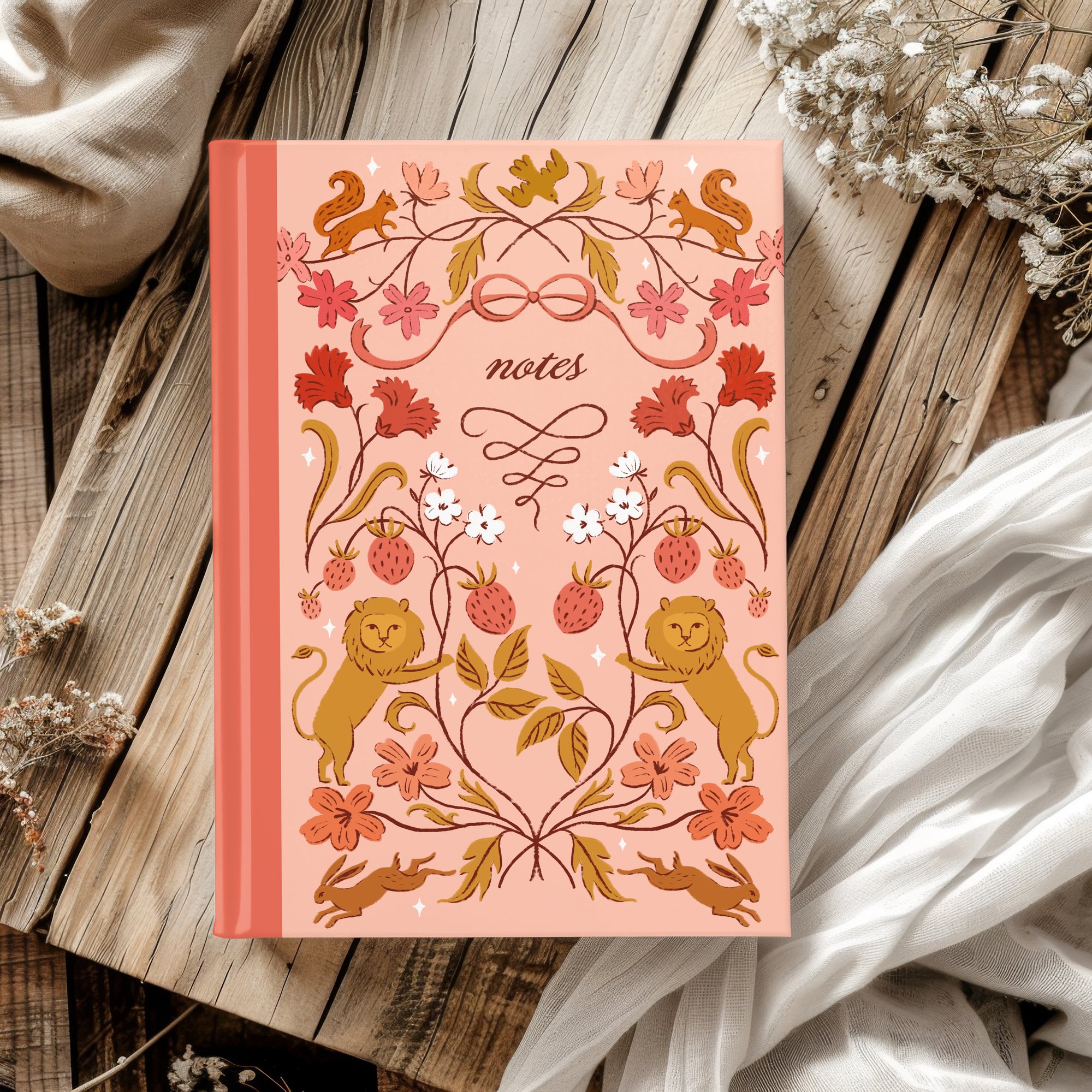 This fanciful notebook design features illustrations inspired by illuminated manuscripts, tapestries and whimsical heraldry. It has a variety of charming animals and flowers, strawberries, and of course a bow, all colored in warm pink, gold, and red shades