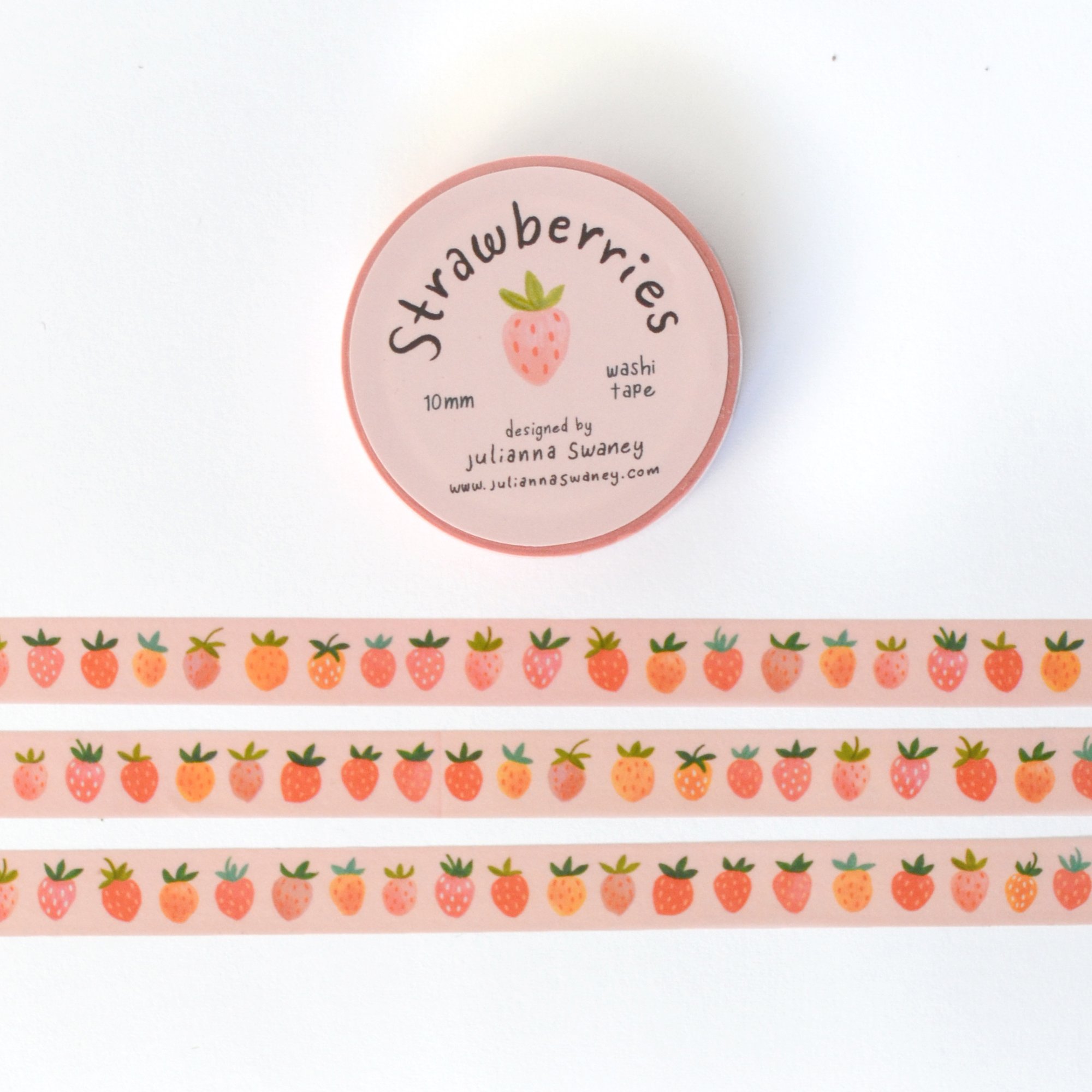 This narrow cute as a button washi tape is made from my original hand painted illustrations. It features string of tiny strawberries in shades of pink on a blush pink background
