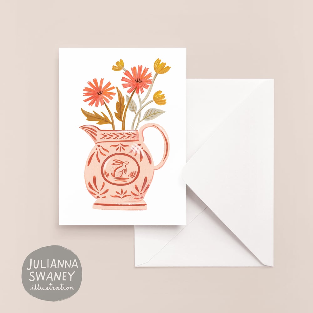 ◆ Brighten someone's day with this greeting card featuring my illustration of cheerful orange and yellow flowers in a pink lusterware pitcher