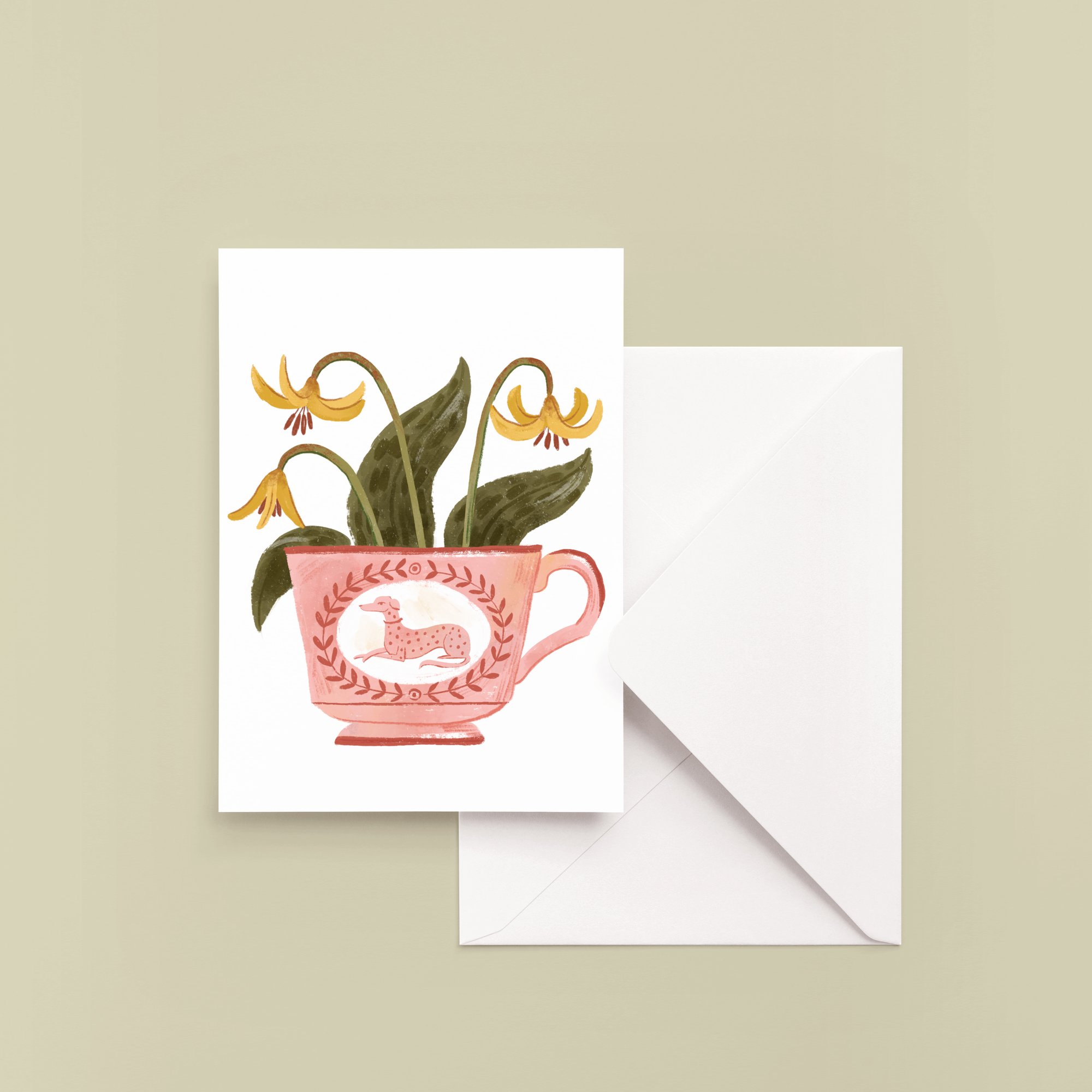 ◆ Brighten someone's day with this greeting card featuring my illustration of early spring wild trout lilies in a pink luster teacup, decorated with a sweet spotted dog